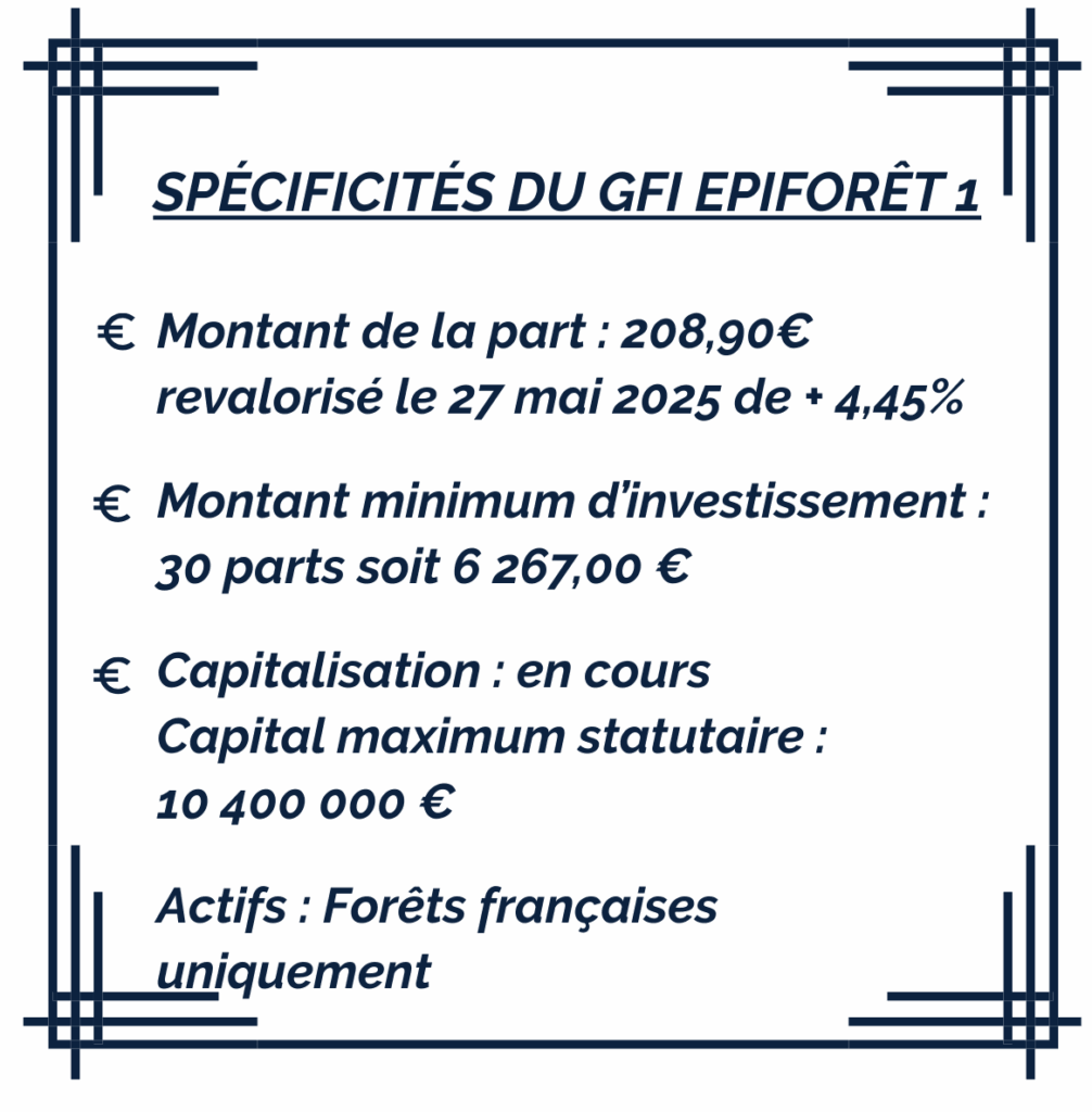 Sous l’impulsion de Michel de Warren, directeur de la gestion, nous avons poursuivi le développement du GFI EPIFORET 1 : revalorisation de la part, acquisition d’une nouvelle forêt, reboisement de parcelles d’essences résilientes porteuses d’avenir.